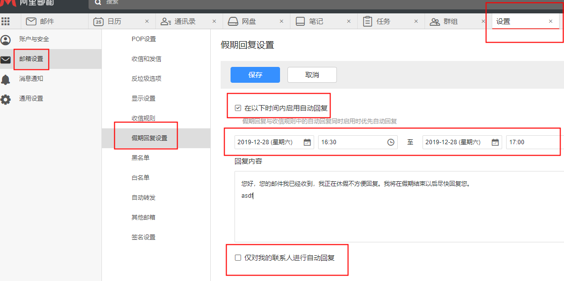 1、登录邮箱后点击右上角“邮箱设置”,在左侧展开设置功能列表中点击"假期回复设置”,然后勾选“在以下时间内启用自动回复”,选择时间,输入回复内容保存即可。