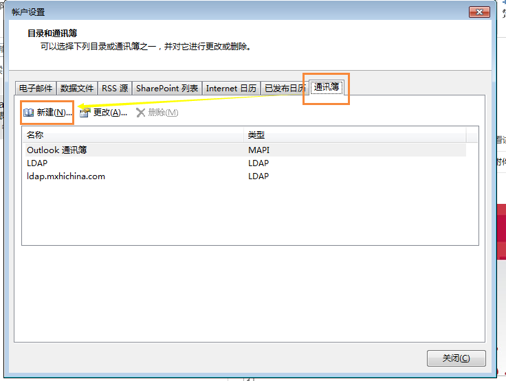 2.在打开的“账户设置”对话框中点击“通讯薄”-》“新建”