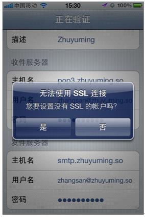 5、单击下一步后,系统将进行验证,系统会提示建立没有 SSL 链接的帐号,请选择 是 。